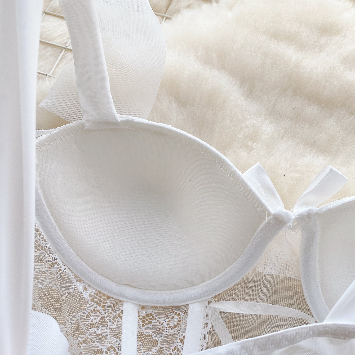 This elegant corset dress set combines delicate lace with layered mesh for a refined look. Designed with adjustable straps, supportive cups, and a lace-up front, it ensures both comfort and style. The lightweight material and matching bottoms make it suitable for special occasions or everyday wear.