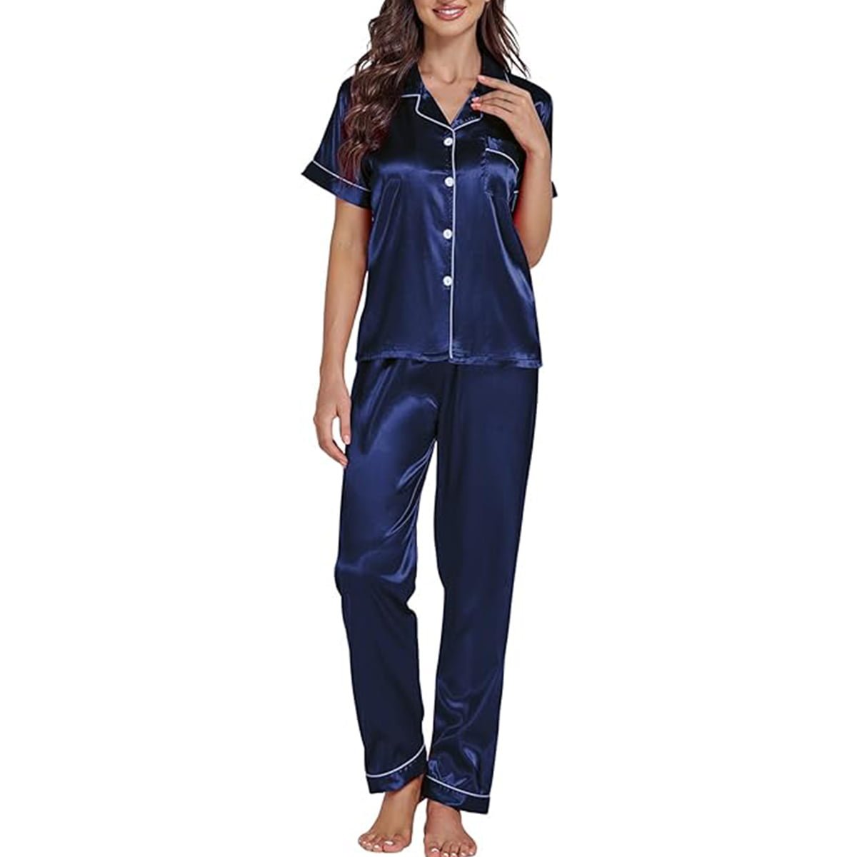 • Button-down design: Adds sophistication and convenience for easy wearability. Matching Full Length: Made from the same high-quality satin material with an adjustable elastic waistband for a snug fit.