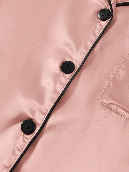 - الخامة: طقم البيجاما مصنوع من قماش ساتان فاخر مكون من 95% بوليستر و5% سباندكس. بيجاما حريرية فائقة النعومة للنساء، خفيفة الوزن ولطيفة على البشرة.